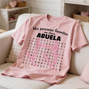 BMSM10 BMSM15 BMSM20 Celebra el orgullo y la alegría de ser Abuela con una camiseta tan especial como su amor por la familia. Esta camiseta personalizada presenta un hermoso diseño de sopa de letras con los nombres de sus personas favoritas, acompañado de una variedad de frases emotivas en español que celebran el vínculo único entre abuela y nietos. Cada nombre se integra cuidadosamente en el rompecabezas, convirtiendo esta prenda en un recuerdo significativo que combina estilo, sentimiento y tradición. Impresa profesionalmente para ofrecer colores vibrantes y duraderos, es el regalo perfecto para cualquier ocasión especial.