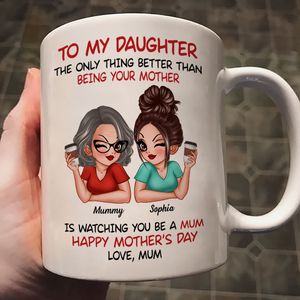 Celebrate the unbreakable bond between mother and daughter with a heartfelt gift she’ll cherish every single day. This beautifully printed personalised mug captures a touching message from Mum, honoring the joy of watching your daughter become an incredible mum herself. Featuring custom names and a charming illustrated design, it’s a meaningful keepsake that turns every coffee or tea moment into a reminder of your love. Make this Mother’s Day unforgettable with a gift created just for her.